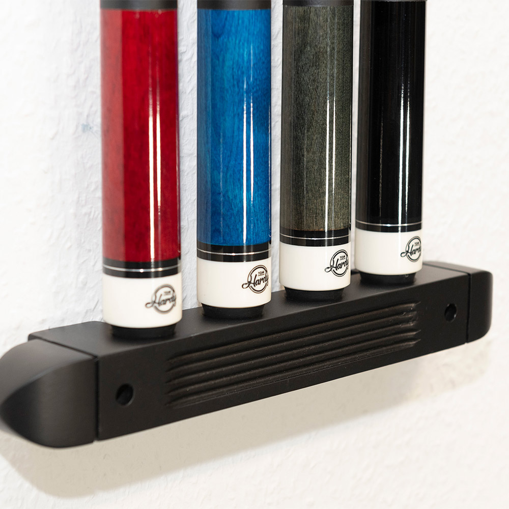 Hochwertiger zweiteiliger Billardqueue Wandhalter Modell Antik aus Rubberwood (biologischem Austauschholz). Das Wandhalter-Unterteil ist mit Mulden versehen, passend für den Gummipuffer am Queueende. Das Oberteil des Halters hat abgerundete PVC-Clips zum schonenden Eindrücken der Oberteile, erhältlich in braun und schwarz, mit jeweils 4-fach sowie 6-fach Einteilung. Abstand Wandhalter von Unterteil zum Oberteil, je nach Queuelänge 100–130 cm.