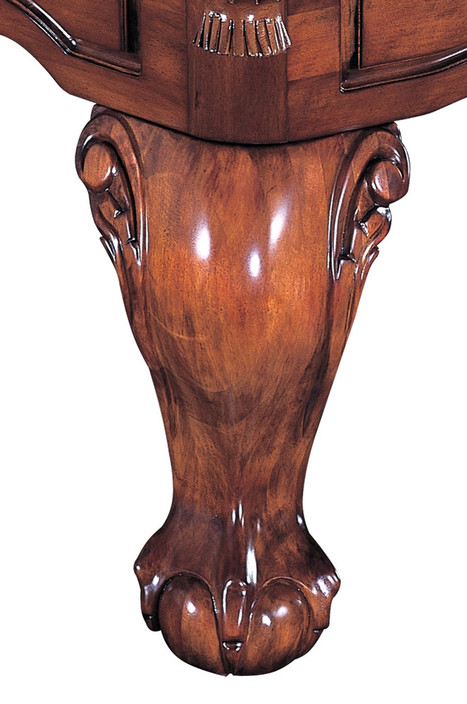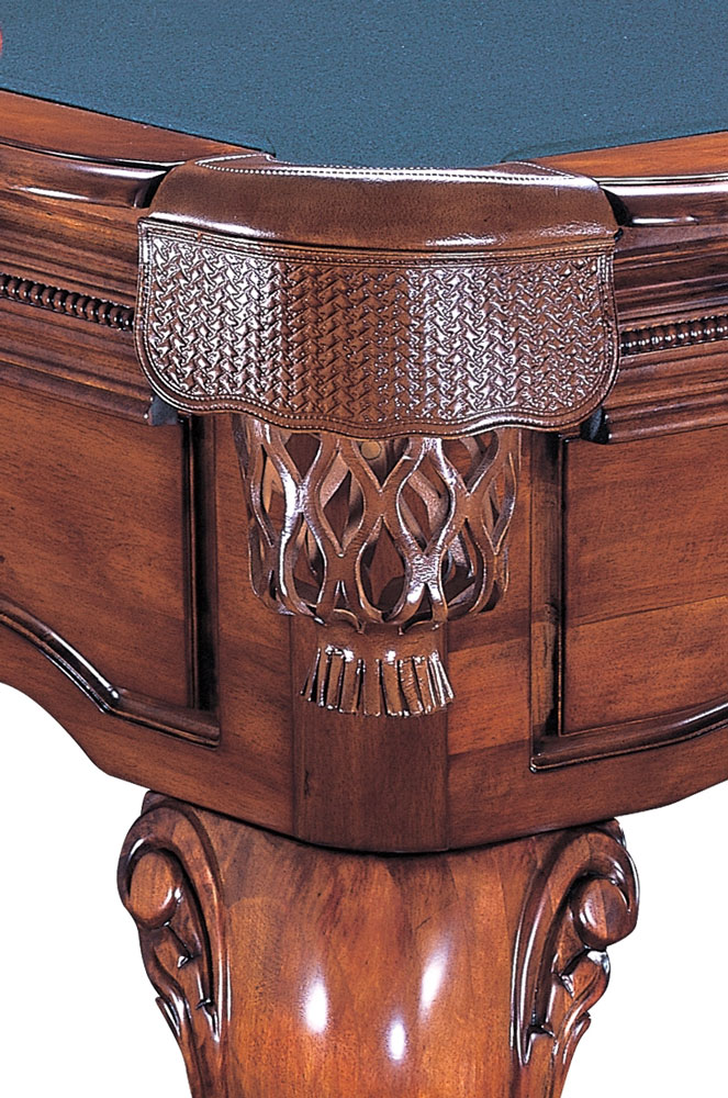 Die extravagante Form des Unterbaus und die mit edlen, handgearbeiteten Ornamenten versehenen, prunkvollen Massivholzfüsse verzaubern jeden Spieler. Das Modell ist aber nicht nur optisch ein Blickfang sondern aufgrund seiner ausgereiften Bauweise auch äussert robust und stabil. Ein weiteres Glanzstück des Golden West sind die wunderschönen, handgearbeiteten Echtledertaschen (Einfallpockets) im passenden antikbraun. Sie unterstreichen die Eleganz dieses hervorragend verarbeiteten und äusserst robusten Billardtisches.
