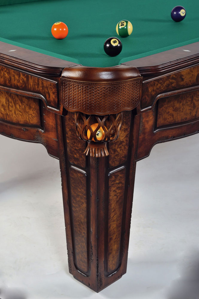 Dieser prächtige Billardtisch Wellington ist der ultimative Poolbillard für den besonders anspruchsvollen Kunden. Kein anderer Tisch ist mit einer solchen Liebe zum Detail und viel Handarbeit Stück für Stück sorgsam produziert worden. Jedes Teil wird aus Massivholzblöcken der Europäischen Rotbuche perfekt herausgearbeitet und mühevoll in aufwendiger Oberflächenbearbeitung mit dem einzigartigen Antik-Look Mammut-Wurzel-Furnier versehen. Für den Unterbau wurde Massivholz Rubberwood gewählt, das durch seinen enormen Härtegrad (härter wie Eiche) absolute Verzugsfreiheit garantiert und somit für die tragenden Unterbauteile ideal ist.