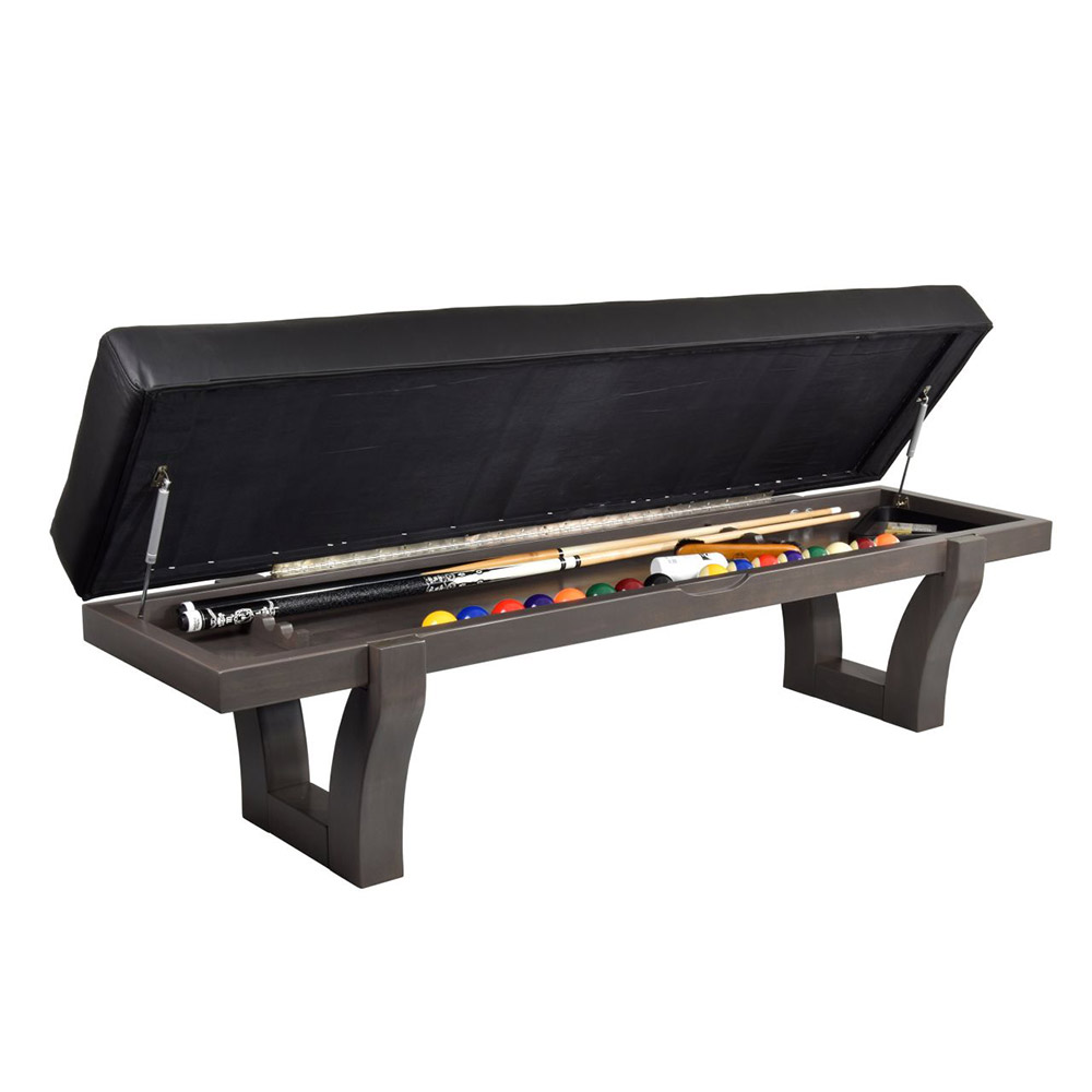 Das interessante Finish ist in „Driftwood“ Optik (dunkelgrau-rauchfarben gebeitzt) gestaltet. Die 3-teilige 25 mm starke Schieferplatte wird auf dem Massivholzunterbau (Poplar Wood) perfekt justiert. Durch die zerlegbare Bauweise kann der Tisch auch in schwer zugängliche Räume transportiert werden. Ein weiterer großer Vorteil ist die nach innen verlagerte Unterbaukonstruktion. Dadurch entsteht eine ideale Beinfreiheit für die Verwendung als Esstisch oder Konferenztisch. Passend zum Tisch gibt es einen Wandhalter für 8 Queues sowie eine lederbezogene Sitzbank im selben Stil. Die aufklappbare Sitzbank Premium hat ein Staufach für das gesamte Billardzubehör