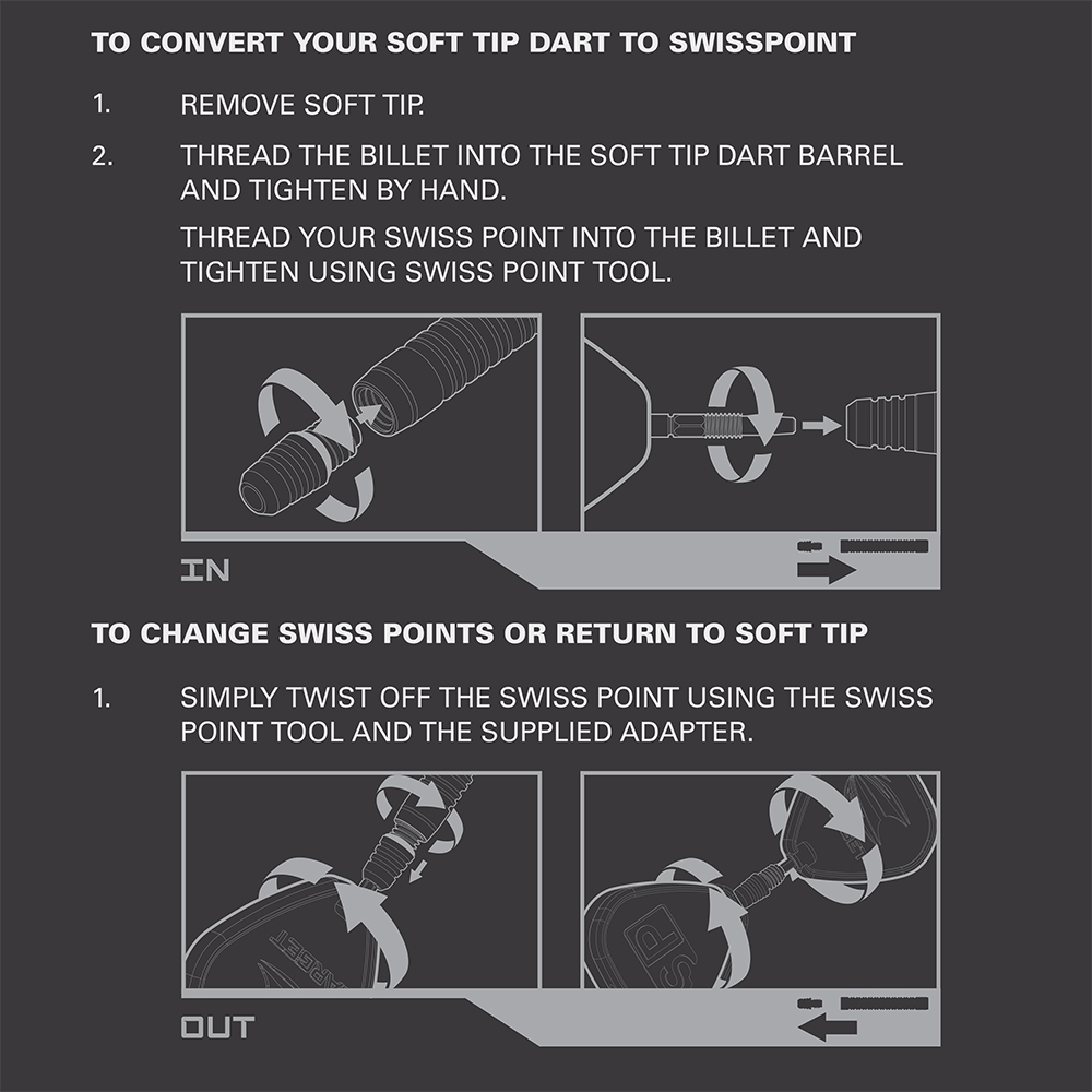 Mit den Target 2BA Swiss Convertern kannst du alle Softdarts in wenigen Sekunden zu Steeldarts umrüsten und dabei die beliebten Target Swiss Point Spitzen benutzen. Die Converter haben auf der zum Dartpfeil gekehrten Seite das Standard-2BA Gewinde und auf der zur Spitze gekehrten Seite die Aufnahme für die Swiss Points. Sie werden einfach in die Softdarts eingeschraubt. Anschliessend können die Swiss Point Spitzen wie gewohnt montiert werden. Auf den letzten beiden Produktbilder kannst du dir die Details genau ansehen.