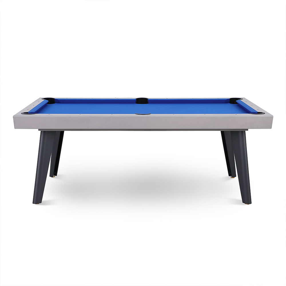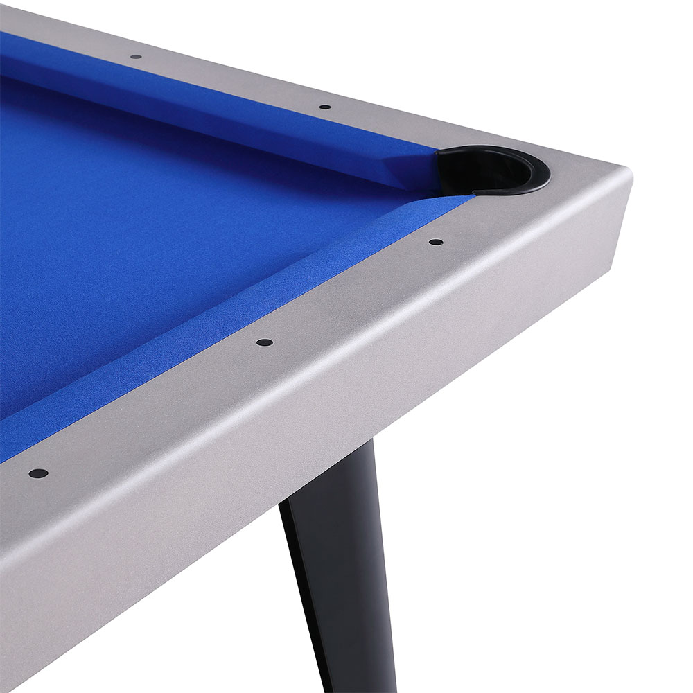 Das Modell Ascona zeichnet sich durch seine moderne Ausführung aus. Die pflegeleichte steinfarbige Aluminium Oberfläche mit blauem Tuch und schwarzen schlanken Standbeinen macht den Billardtisch zu einem Schmuckstück das zu jedem Einrichtungsstil passt.