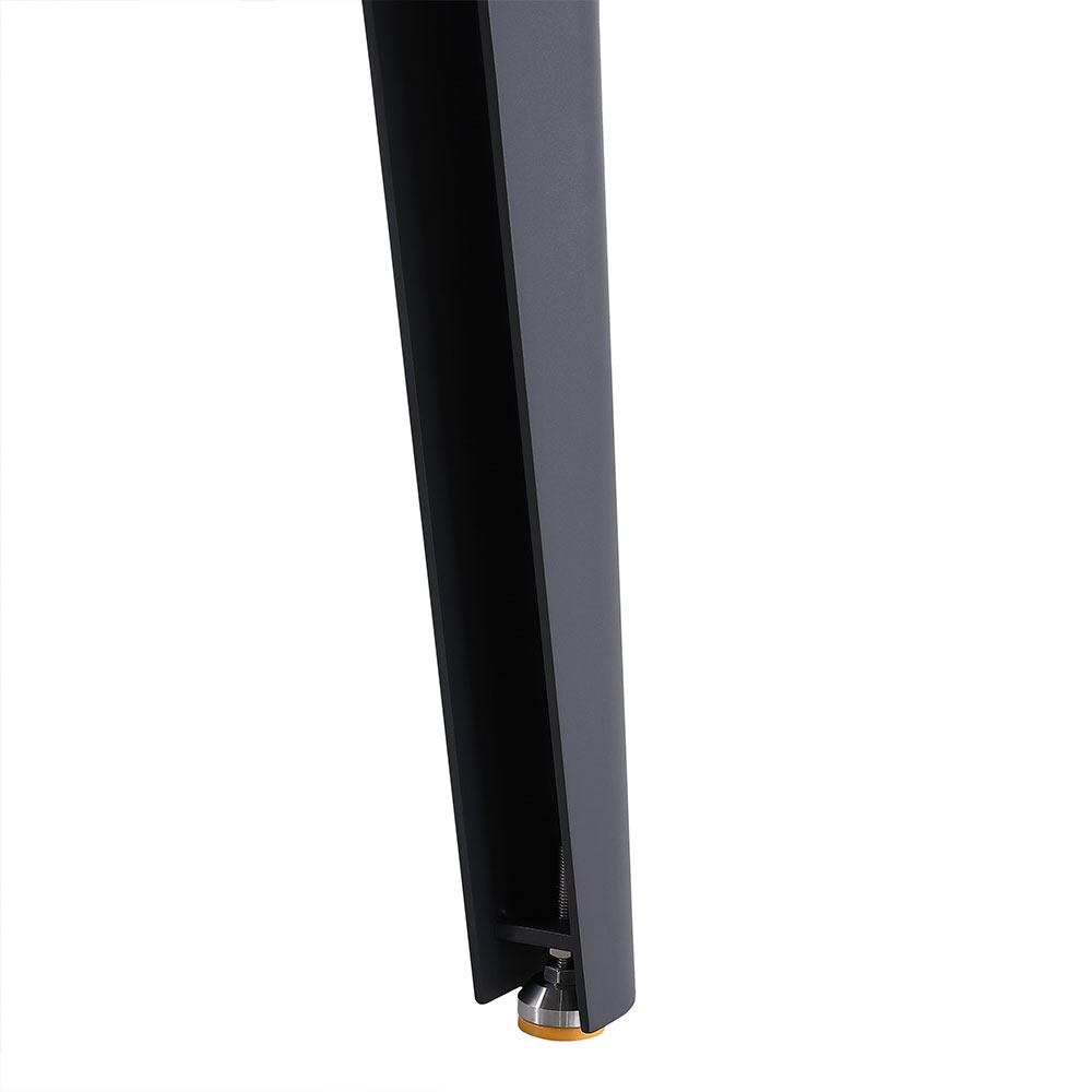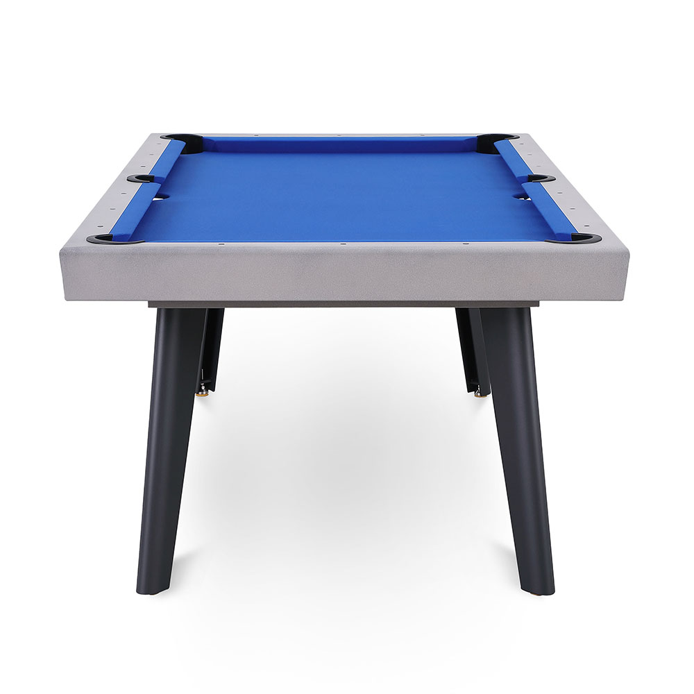 Mit der passenden dunkelgrauen 2-teiligen Abdeckplatte aus Aluminium kann der Billardtisch schnell zum Ess- oder Arbeitstisch umgewandelt werden. Durch die schlanke Fusskonstruktion ergibt sich viel Beinfreiheit. Die Füsse bestehen aus schwarz eloxiertem Metall und sind am Fussende mit kleinen Stellfüssen versehen, um Unebenheiten des Bodens auszugleichen. Die geräuscharmen Ball-Einfalltaschen können nach Spielbetrieb unsichtbar nach obengeklappt werden.