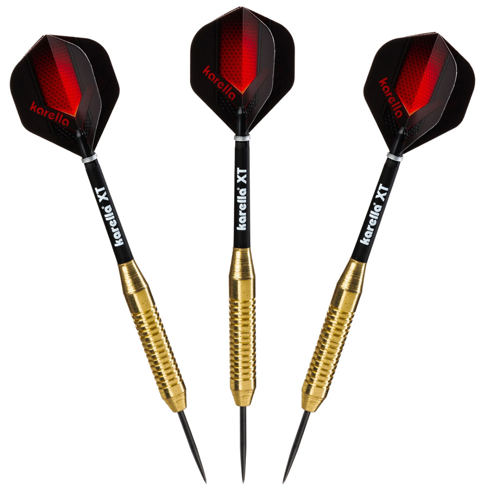 Die Karella XT-Serie als Steel- und Softdart verbindet Design und Qualität bei einem unschlagbaren Preis-Leistungs-Verhältnis. Der XT-1 Steel ist das ideale Dartset für Einsteiger, mit perfekter Gewichtsverteilung. Die klassische Zylinderform des messingfarbenen Barrels weisst eine leichte Ringstruktur auf und bietet ausreichend Orientierung für die Finger. Dadurch sind auch für Freizeitspieler hohe Scores möglich. Der Dart kommt mit Profi Karella XT-Schäften (Medium) und 100 Mic. starken XT-Profi Flights. Verpackt ist das Set in einem schönen Blister inklusive Darthalter. Karella XT Serie – Ideal für Einsteiger und Hobbyspieler.