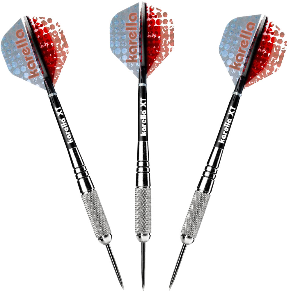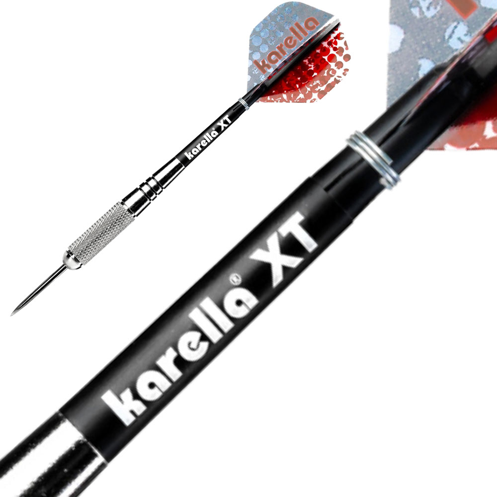 Die Karella XT-Serie als Steel- und Softdart verbindet Design und Qualität bei einem unschlagbaren Preis-Leistungs-Verhältnis. Der Karella XT-5 Steel ist ein elegant verchromter Messingdart mit einem torpedoförmigen Barrel. Durch den leicht angerauten vorderen Bereich hat der Dart einen angenehmen Grip und eignet sich hervorragend für Spieler, die den Dart möglichst weit vorne halten. Die perfekte Gewichtsverteilung ermöglicht eine ideale Flugbahn des Darts und verzeiht leichte Fehler. Der Dart kommt mit Profi Karella XT-Schäften (Medium) und 100 Mic. Starken XT-Profi Flights. Verpackt ist das Set in einem schönen Blister inklusive Darthalter. Karella XT Serie – Ideal für Einsteiger und Hobbyspieler.