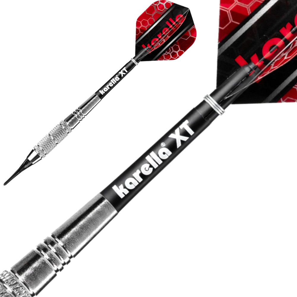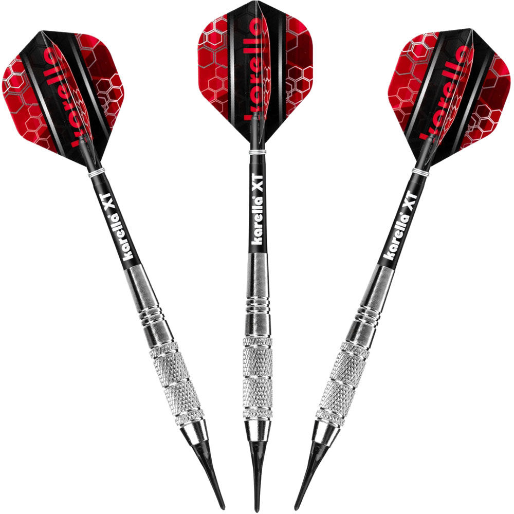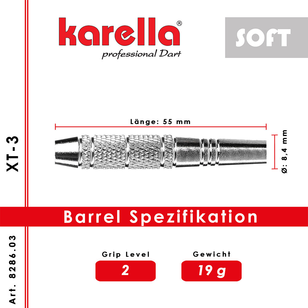 Die Karella XT-Serie als Steel- und Softdart verbindet Design und Qualität bei einem unschlagbaren Preis-Leistungs-Verhältnis. Der XT-3 Soft hat einen hochwertig verchromten Messingbarrel im klassischen Look. Durch die Torpedoform sowie die unterschiedlichen Riffelungen und Griffbereiche hat der Karella XT-3 Soft ein hohes Griplevel. Das ermöglicht dem Spieler einen gleichmässigen Wurf, die Basis für konstant hohe Scores. Der XT-3 wird mit Profi Karella XT-Schäften (Intermediate) und 100 Mic. starken XT-Profi Flights geliefert. Verpackt ist das Set in einem schönen Blister inklusive Darthalter. Karella XT Serie – Ideal für Einsteiger und Hobbyspieler.