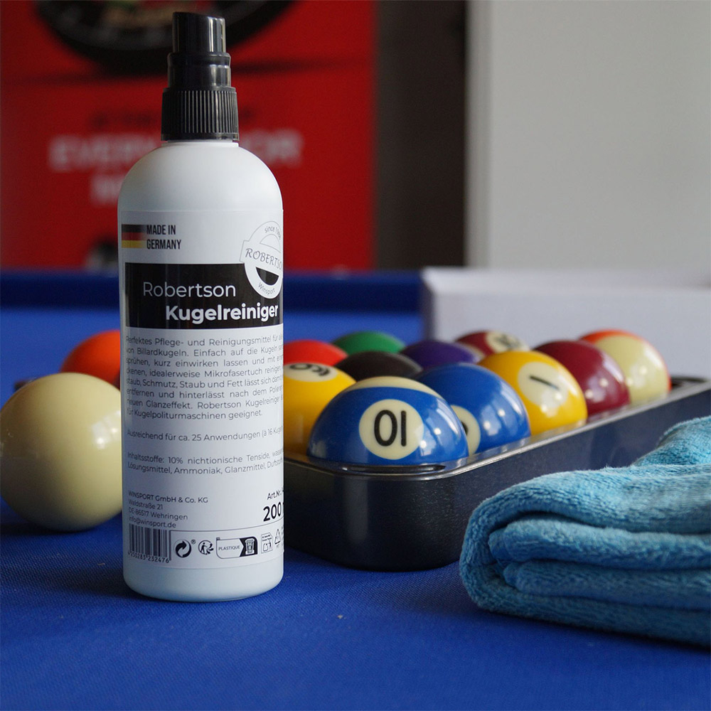Perfektes Pflege- und Reinigungsmittel für alle Arten von Billard- oder Snookerkugeln. Mit dem Druckzerstäuber einfach auf die Kugeln sanft aufsprühen, kurz einwirken lassen und mit einem trockenen, idealer Weise mit einem Mikrofasertuch reinigen. Kreidestaub, Schmutz, Staub und Fett lassen sich damit einfach entfernen und nach dem Polieren erhält die Kugel einen neuen Glanzeffekt. Der Robertson Kugelreiniger ist auch für die Verwendung von Kugelpoliermaschinen gut geeignet. Inhalt: 200 ml, ausreichend für ca. 25 Anwendungen á 16 Kugeln. Lieferumfang: Lieferung inkl. hochwertigem Mikrofasertuch.