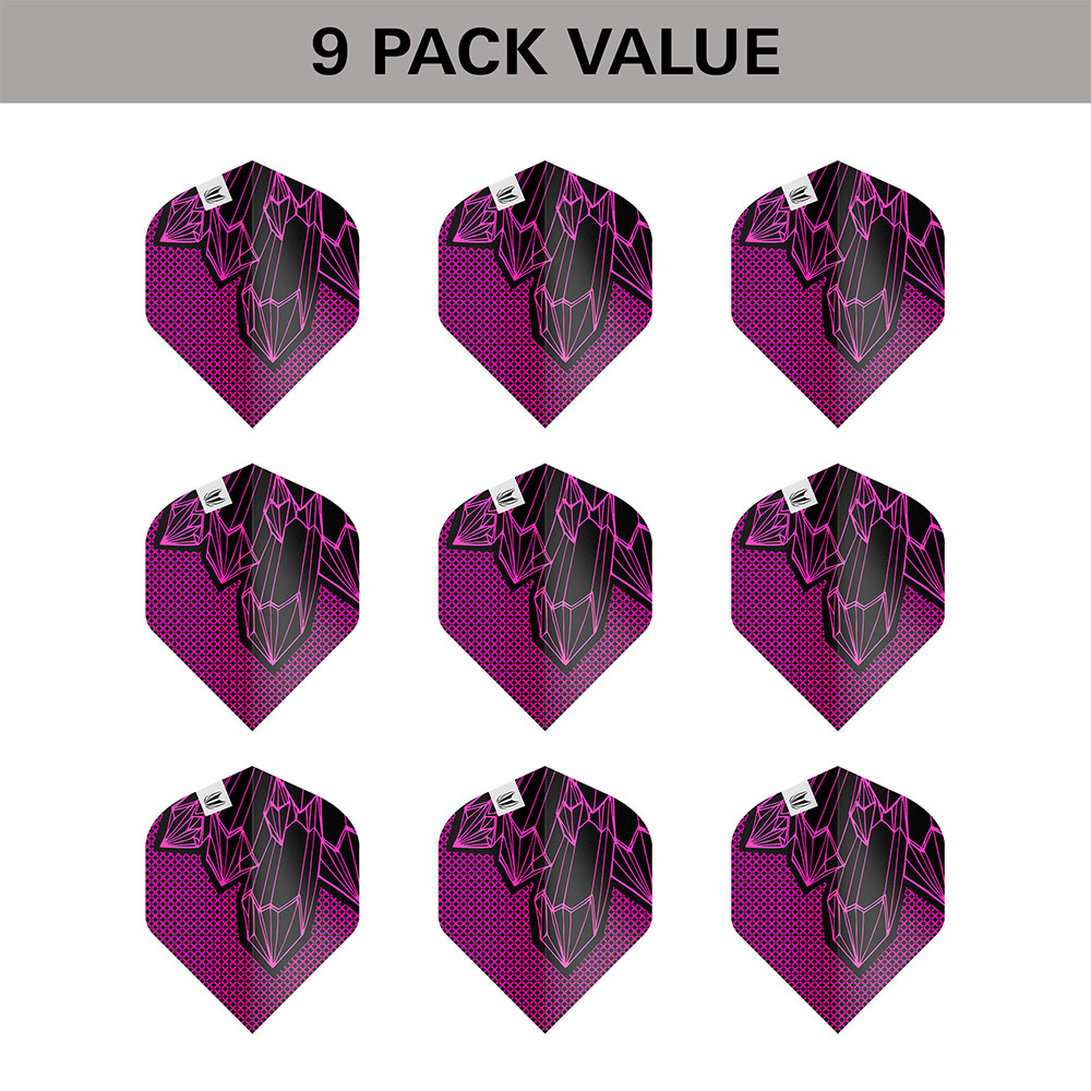 Diese Flights der Generation 2 wurden in Zusammenarbeit mit Lorraine Winstanley entwickelt und spiegeln ihren kühnen, konzentrierten Spielstil mit einem auffälligen geometrischen Design in Pink und Schwarz wider. Das kantige, kristalline Muster ist vom Griffprofil des Darts und Lorraines präzisen Würfen inspiriert und sorgt für eine selbstbewusste visuelle Identität, die auf der Dartscheibe hervorsticht.