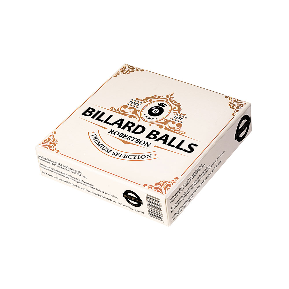 Robertson Kugeln entsprechen mit exakt 2¼-Zoll Durchmesser (57,2 Millimeter) und 6 Unzen Gewicht (ca. 170 Gramm) den Vorgaben. Diese Kugeln wurden hinsichtlich Qualität und Sicherheit der Rohstoffe und Komponenten von SGS geprüft. Die auffällige intensive Farbgebung mit den grossen Nummernringen machen die Kugeln einzigartig schön.