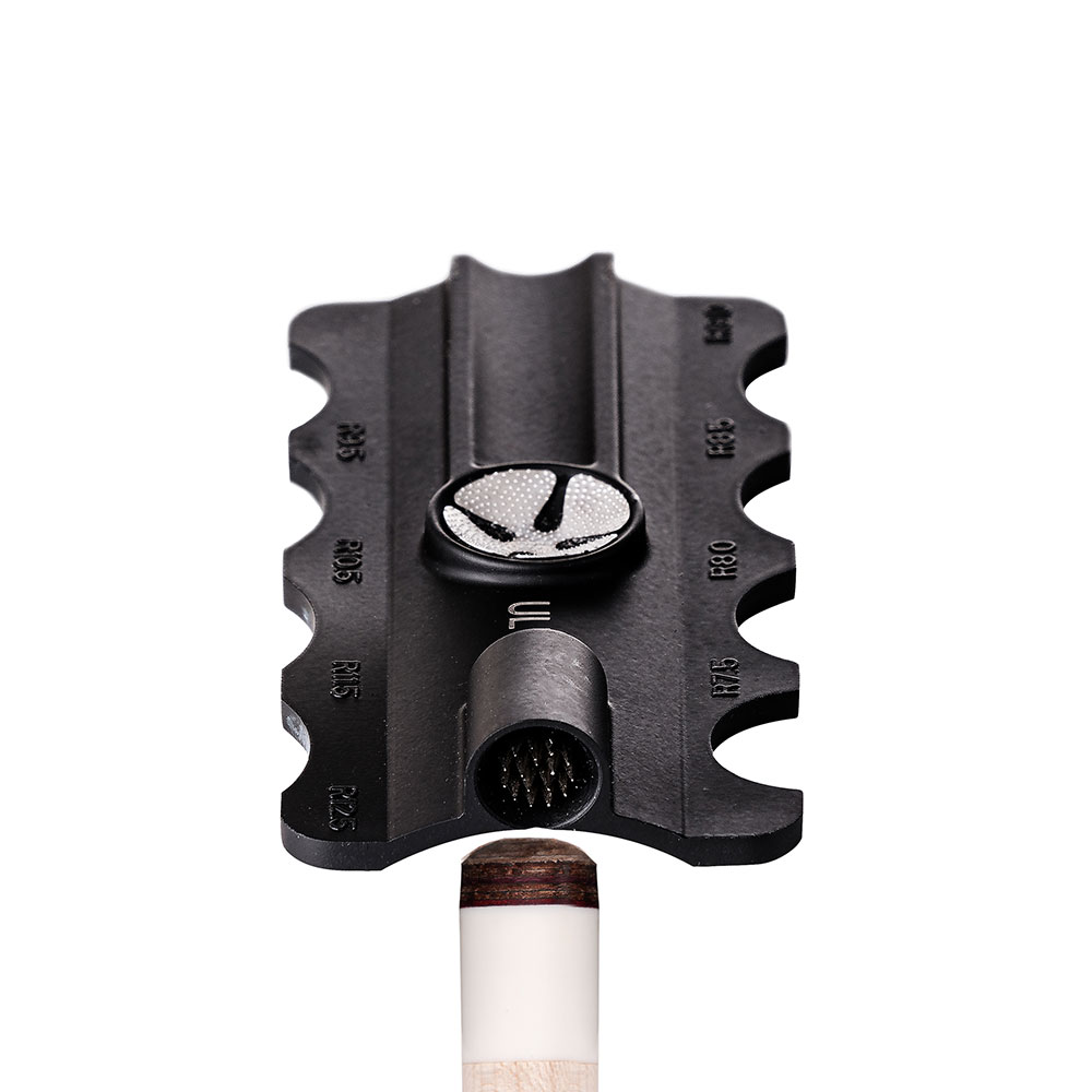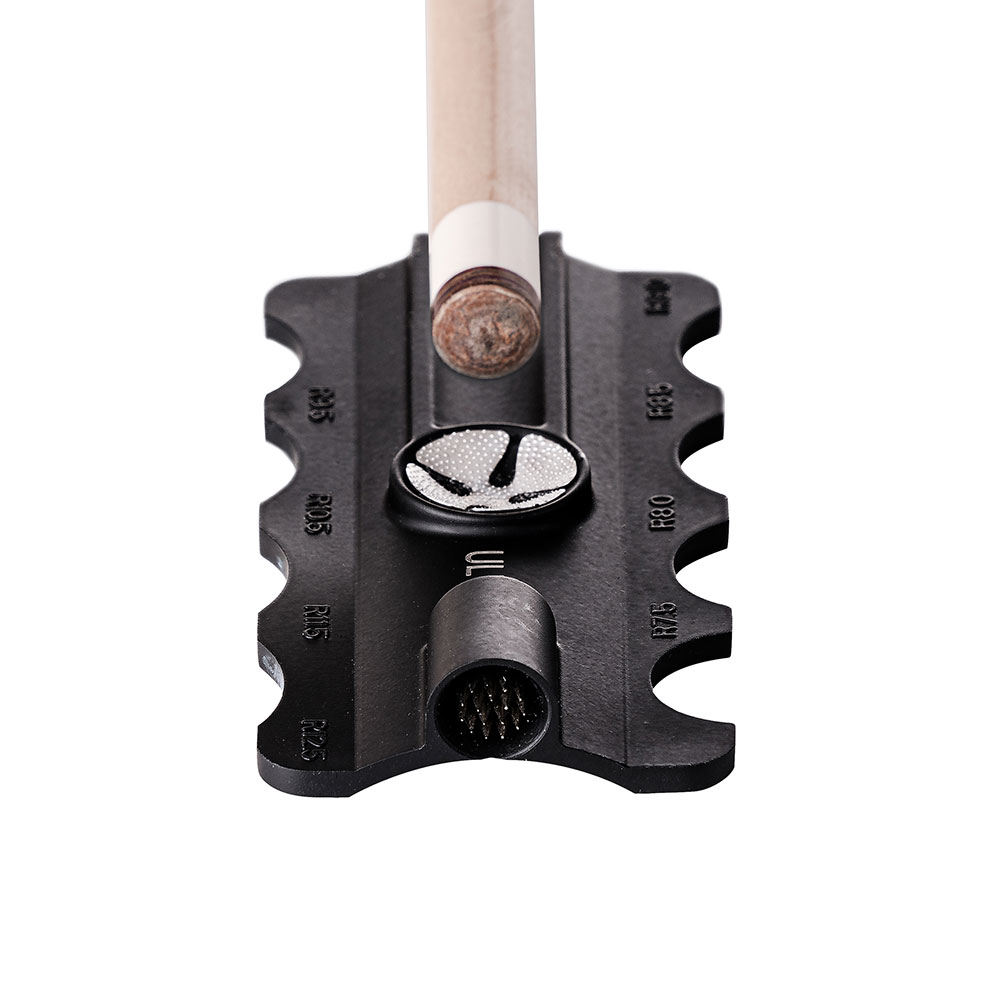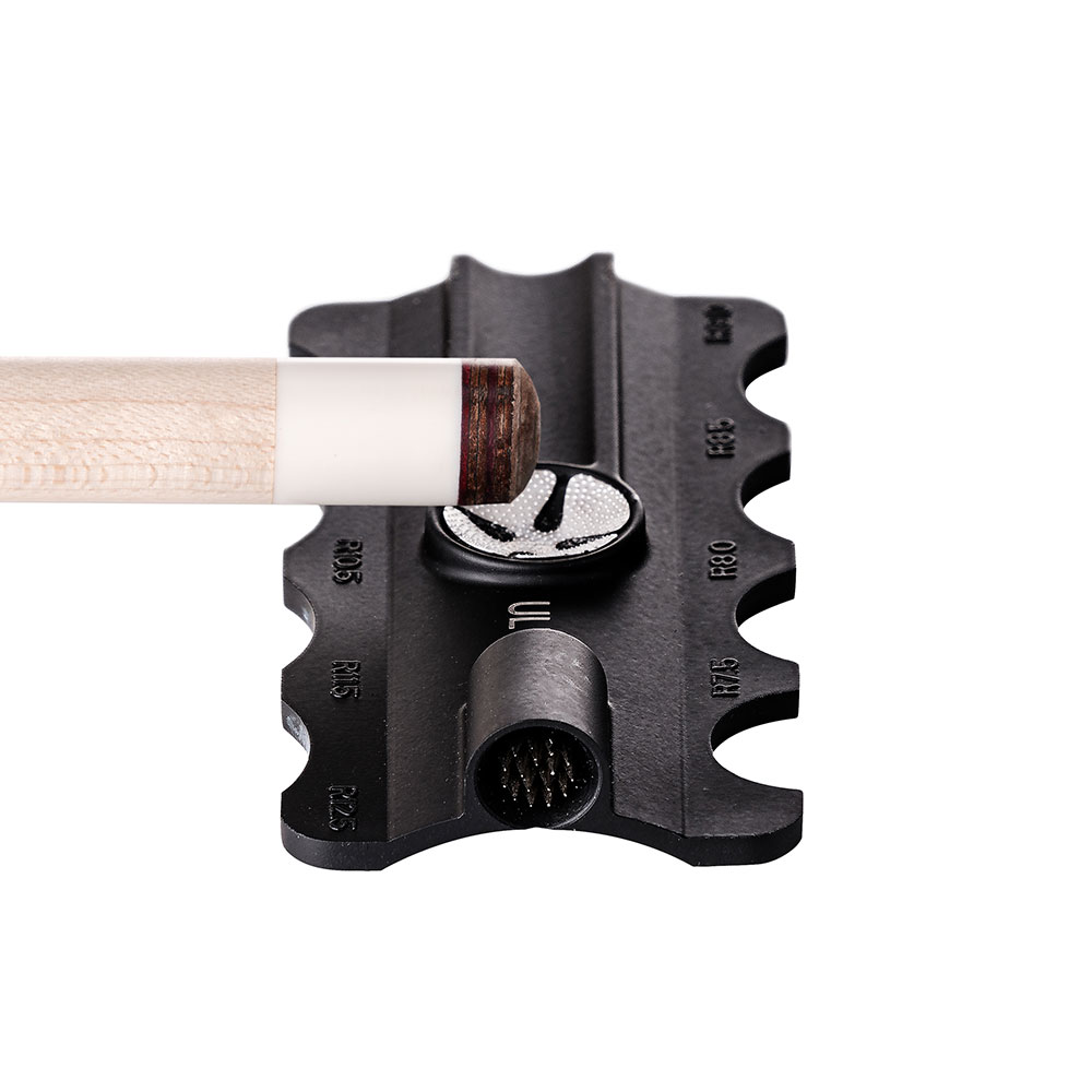 Die eingearbeitete schmale 4 cm lange Kunststoffschiene dient dazu, durch Reibung der Lederspitze deren Kante zu „härten“. Was den Trimmer „Ultimo“ einzigartig macht, sind die seitlich angebrachten Mulden. Sie sind nicht nur bei der Handhabung aller Tools sehr nützlich, weil man das Werkzeug immer fest im Griff hat, sondern dienen zur Kontrolle, ob der gewünschte Radius der Lederspitze gegeben ist. Diese Schablone verfügt über 8 verschiedene Radien - Angaben. Vom Radius 7,5 bis 12,5 kann man von 9 mm Snookerleder bis 14 mm Pool einfach alle Rundungen exakt und schnell prüfen. Der „Ultimo“ Trimmer ist von der Vielseitigkeit, Zweckmässigkeit und praktischen Handhabung her die absolute die Nr. 1 mit dem man jahrelange Freude am Gebrauch haben wird.