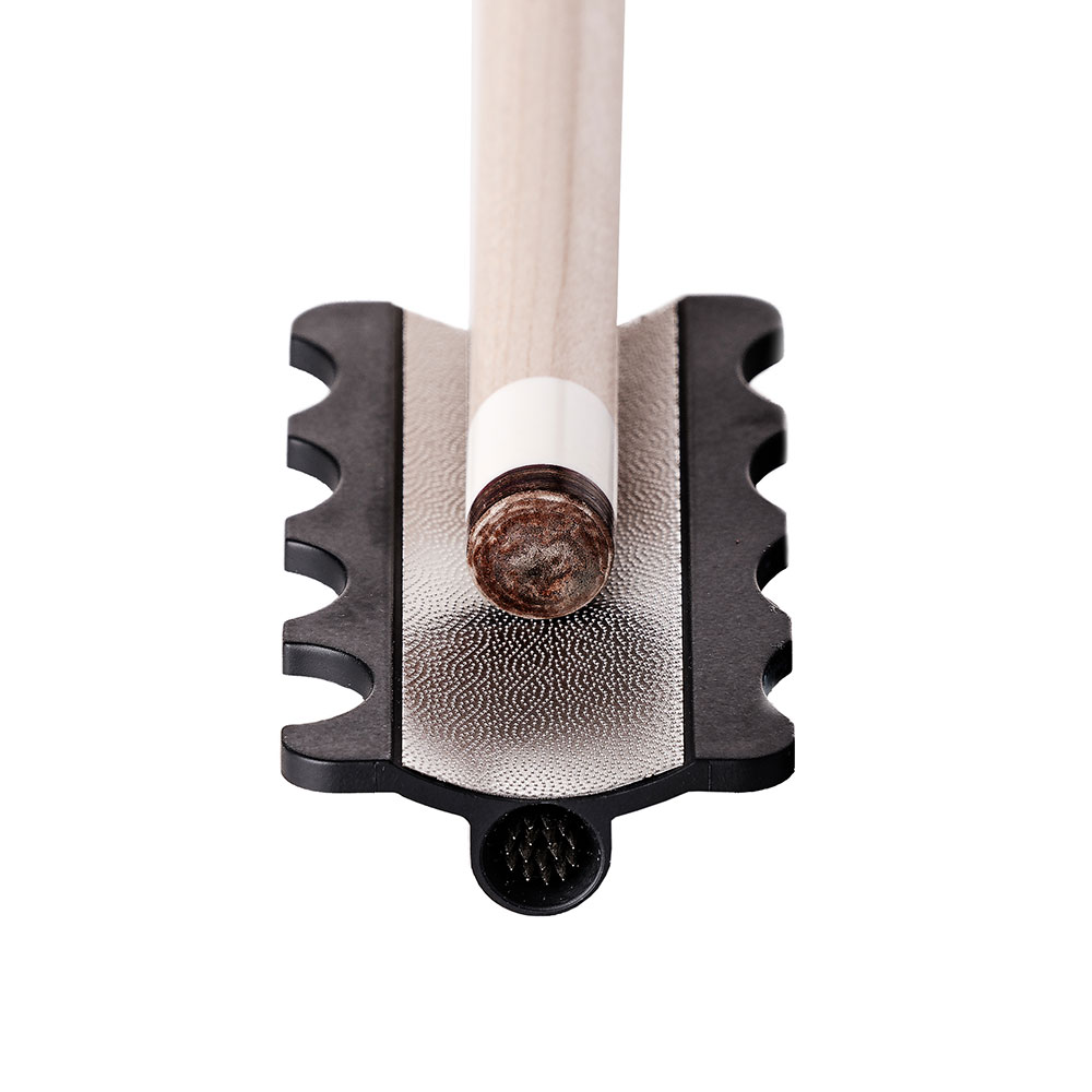 Das handliche 9 x 4 cm grosse Werkzeug besteht aus weichem flexiblem Kunststoff, in das rückseitig eine Stainless –Steel Schleiffläche eingearbeitet wurde. Mit der Bogenkrümmung dieser Feile kann das Leder und vor allem auch die Lederkante wieder perfekt in Form gebracht werden. Eine gleichmässig geformte Kante ist die Voraussetzung zum Anspielen des Spielballs besonders bei Effet Stössen. Auf der Vorderseite befinden sich gleich 3 nützliche Tools: Ein aus Aluminium geprägter runder Trimmer ist mittig eingearbeitet. Oben befindet sich ein kleiner runder Zylinder aus dem 20 kleine Metallspitzen herausragen. Damit kann man die Poren der Oberflächen des Klebeleders etwas „aufpicken“ um optimalste Kreidehaftung zu gewährleisten.