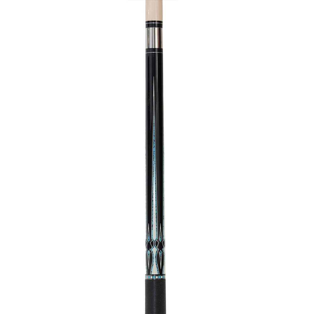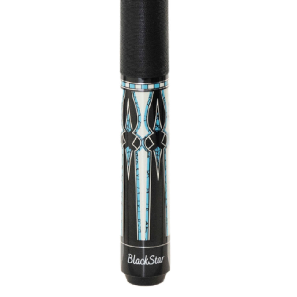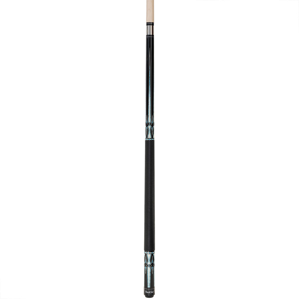 Einzigartige Optik bietet der BlackStar, dessen Design aus dem indianischen Arizona stammt. Die Region ist für die Verwendung von Muschel und Türkissteinen weltbekannt. Das schwarz lackierte Unterteil dient als Grundlage für die filigranen, elfenbeinfarbigen optischen Einlegearbeiten mit Türkisen-Dekoren. Die hochwertigen Zierringe, die mit zusätzlichen Silberringen versehen sind, vollenden das Modell. Passend dazu hat der BlackStar ein einfarbig schwarzes Leinengriffband, das der Hand ein angenehmes Gefühl vermittelt. Das Ahornoberteil höchster Qualitätsstufe ist mit einem 12,5mm Mehrschicht-Klebeleder ausgestattet. Verbunden wird das Oberteil durch ein patentiertes Quick Joint – Gewinde. Der Queue BlackStar wird inklusive Gewindeschutz geliefert. Länge ca. 147cm