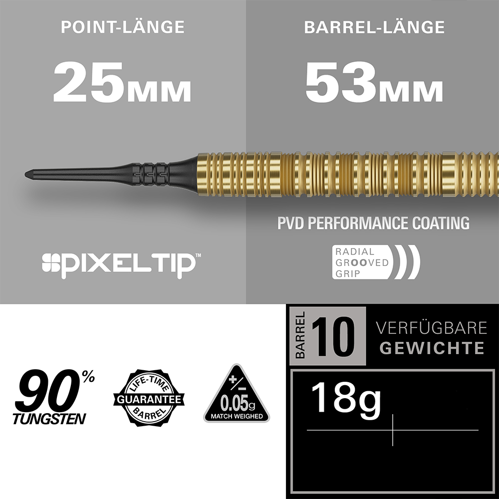 Das gerade Barrel-Design fördert Vielseitigkeit, passt sich einer Vielzahl von Griffstilen an und unterstützt gleichzeitig einen kontrollierten Abwurf sowie eine stabile Flugbahn. Die präzise Bearbeitung der radialen Rillen sorgt für ein subtiles Griffgefühl, ohne aufdringlich zu wirken, sodass Spieler auch bei längeren Spielsitzungen Komfort und Selbstvertrauen bewahren können.