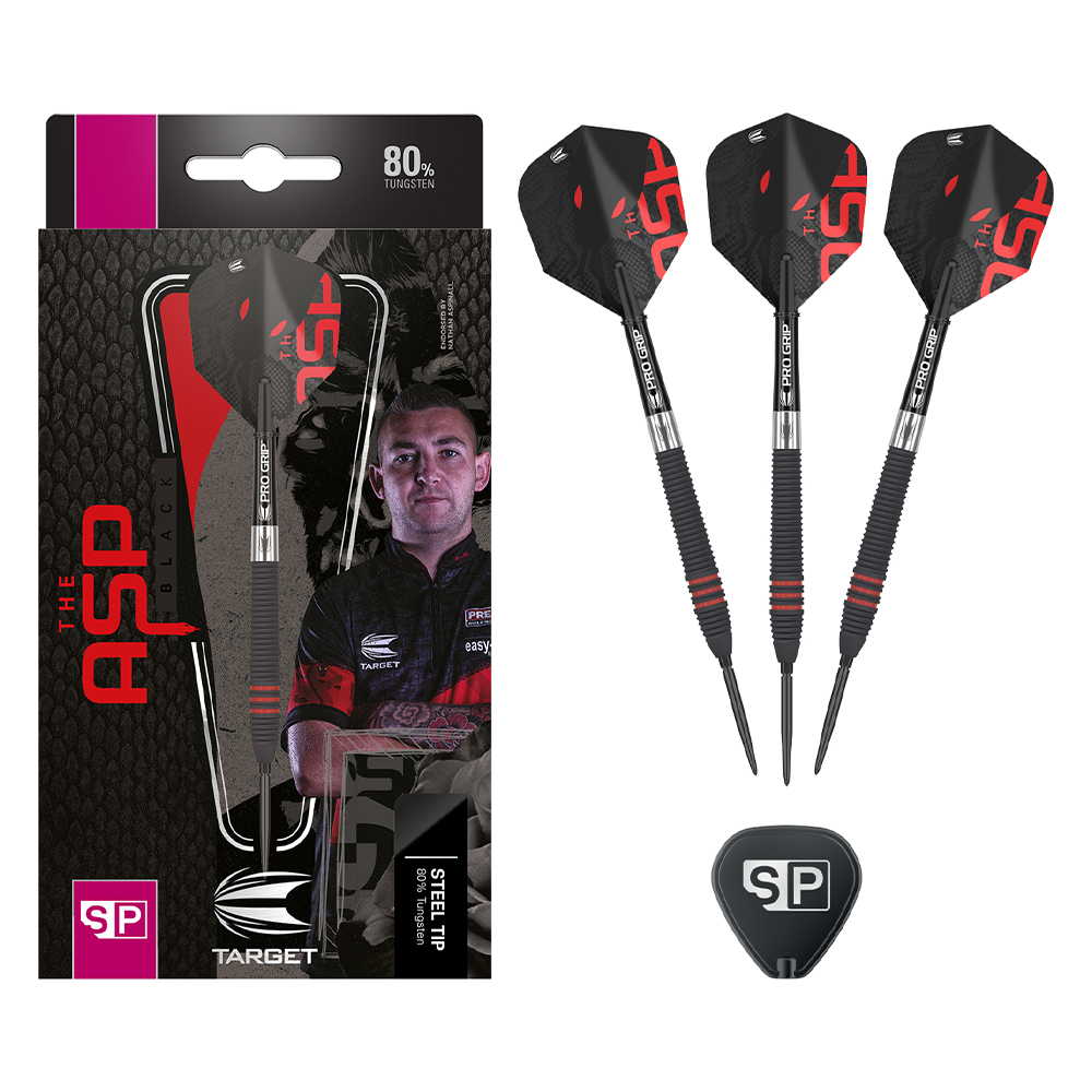 Die Target Nathan Aspinall 80 Black Swiss Point Steeldarts kommen in der für ASP typischen leichten Tropfenform. Dadurch wird der Schwerpunkt leicht nach vorne verlagert. Zur optimalen Orientierung wurden im vorderen Bereich des Barrels drei rote Vertiefungen angebracht.