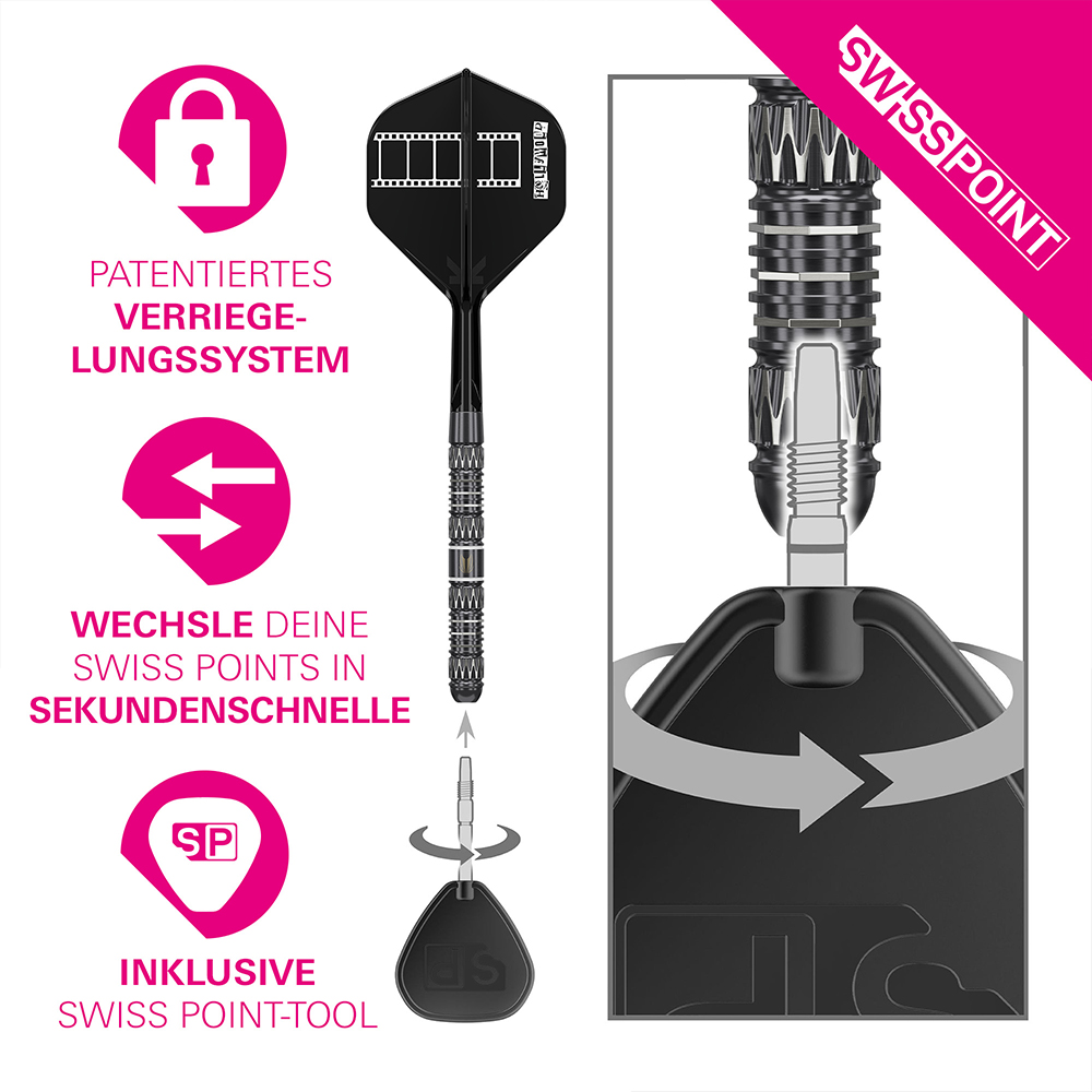 Das Set enthält Swiss GRD Points in den Längen 30 mm und 35 mm, sodass Sie Ihr Setup individuell auf Ihren Wurf abstimmen können. Das patentierte Swiss Point System von Target ermöglicht einen schnellen und sicheren Wechsel der Points mit dem mitgelieferten Premium-Werkzeug, für festen Halt und mühelose Anpassung ohne Unterbrechung des Spiels.