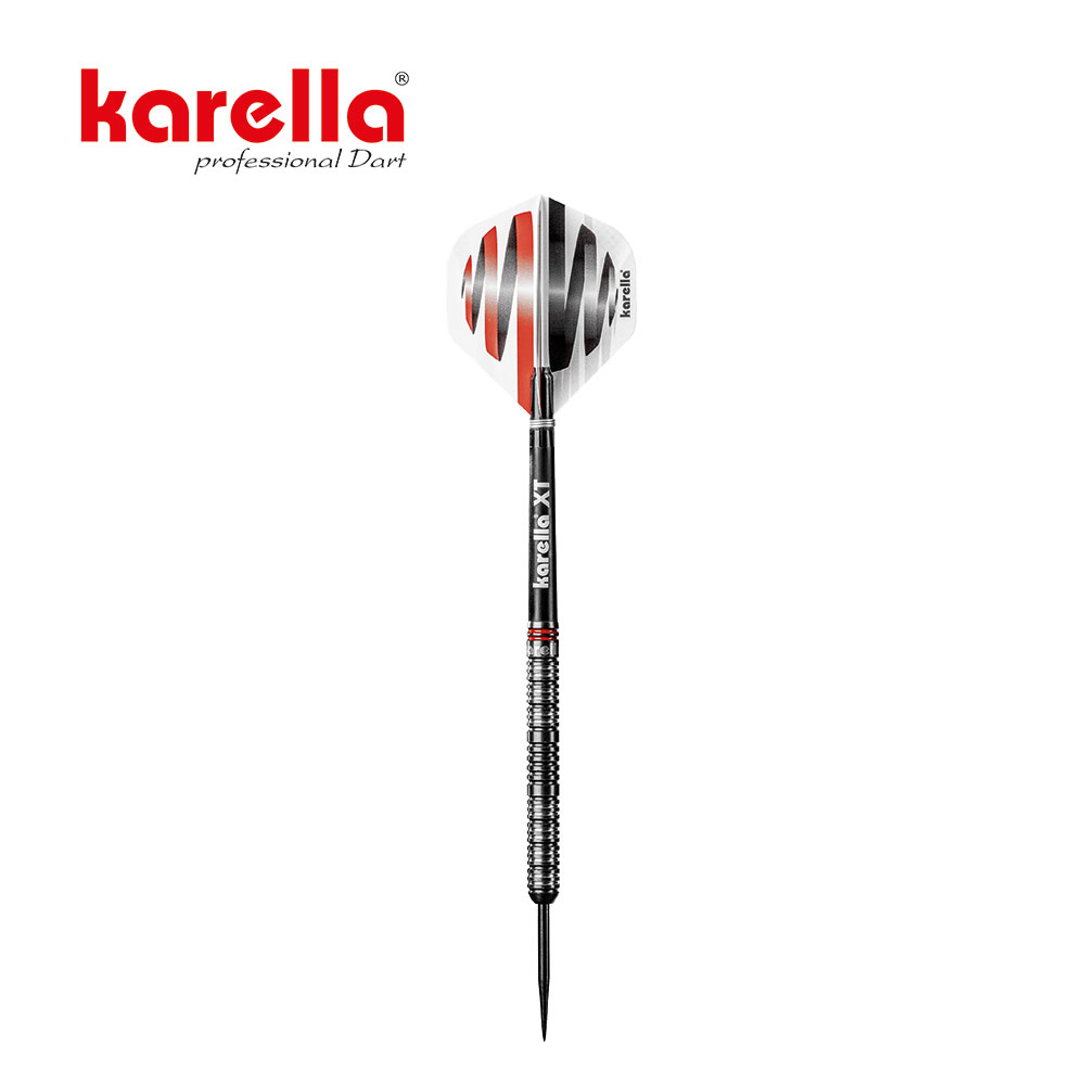 Ein Dart der absoluten Spitzenklasse. Der zylinderförmige Barrel besteht zu 90% aus Tungsten und erhält durch eine PVD-Beschichtung seine auffällige schwarze Färbung und angenehme Haptik. Der Barrel verfügt über einen gleichmäßigen Tripleringgrip, der im mittleren Bereich durch eine einfache Ringstruktur unterbrochen wird. Die typischen beiden roten Karellaringe am Ende des Barrels runden das ansprechende Design des Barrels ab. Komplettiert wird der Dart durch die extra entwickelten Karella XT Shafts sowie hochwertige und optisch ansprechende Karella Profi Flights. Der Steeldart ist im Gewicht 24g erhältlich.