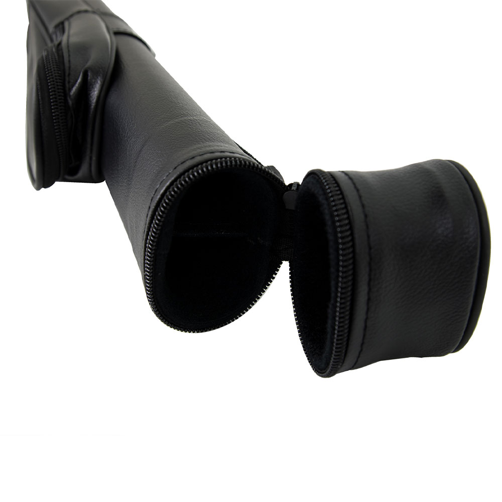 Dieser schwarze Queueköcher aus Kunstleder bietet Platz für ein Unter- und ein Oberteil. Der praktische Schultergurt ermöglicht optimalen Tragekomfort. An der Seite hat der Köcher eine Zubehörtasche für Kleinteile. Der Köcher bietet optimalen Schutz vor äusseren Einflüssen wie zum Beispiel Spritzwasser, Temperaturschwankungen oder Stössen.