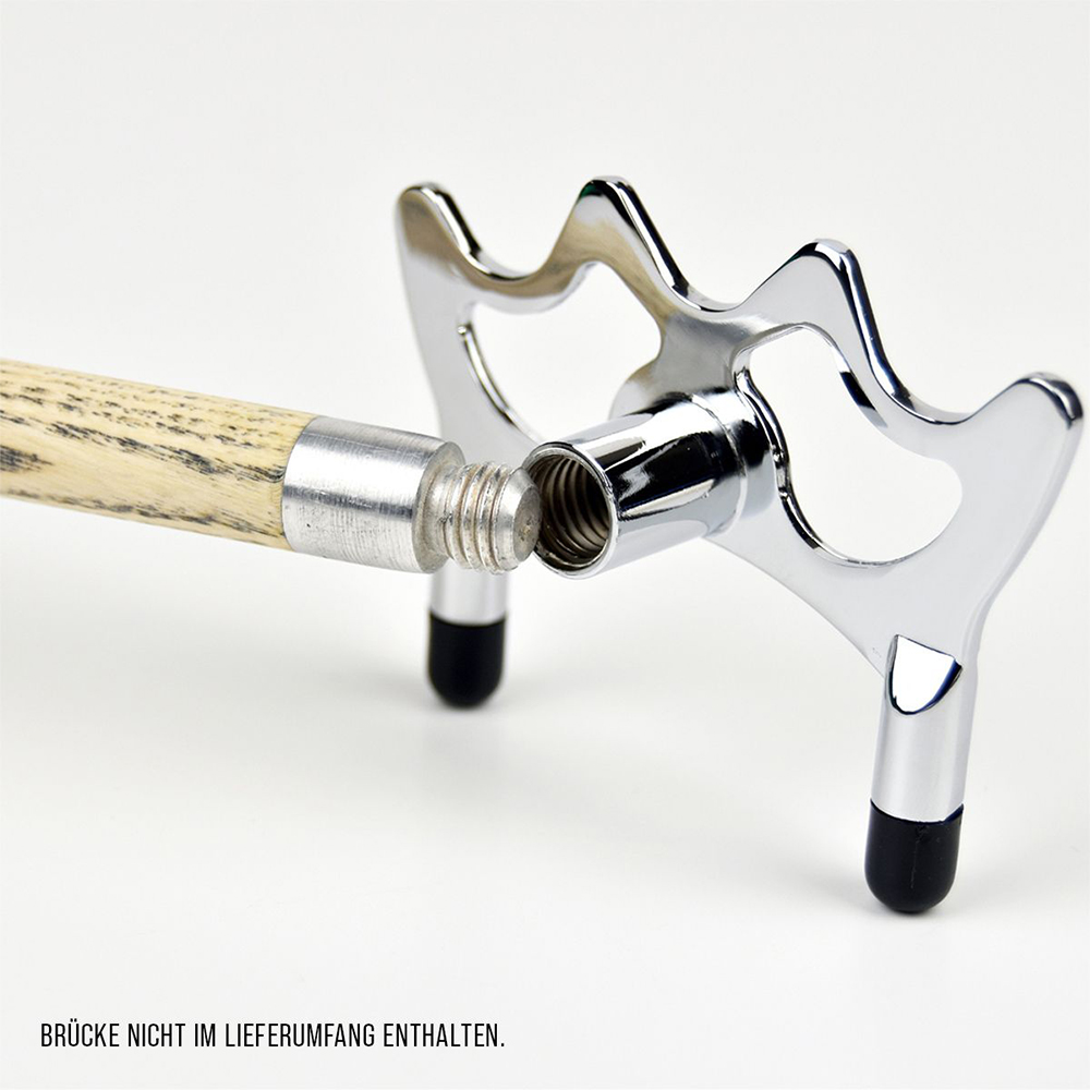 Der Brückenqueue auch Hilfsqueue genannt besteht aus Eschenholz und dient als Verlängerung und Spielhilfe bei Pool- und Snookertischen. Auf das Alugewinde das an der Queuespitze angebracht ist, wird die ausgewählte Queuebrücke fest eingeschraubt. Die Anwendung ist erforderlich, wenn die Stellung des weissen Spielballs die übliche Visierstellung mit den Fingern nicht zulässt. Das kommt vor, wenn der Spielball zu weit entfernt oder von einem anderen Ball ungünstig verdeckt ist. Durch die unterschiedlich hohen Brücken ergibt sich immer eine geeignete Stellung daraus um mit seinem Spielqueue dennoch eine perfekte Anvisierung des Spielballs zu ermöglichen. Der Brückenqueue ist ein erlaubtes Hilfsmittel und sollte bei jedem Billardtisch griffbereit zu Verfügung stehen.
