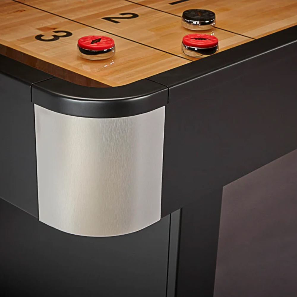 Dieser Shuffleboard-Tisch garantiert familienfreundlichen Spass mit einer optimalen Spielbarkeit. Er verfügt über ein stromlinienförmiges, modernes Design mit mattschwarzer Oberfläche, hübsche silbermetallic strukturierte Laminatecken, eine Spielfläche aus nordamerikanischem Ahornholz (geschützt mit Polymerharz und einer lebenslangen Garantie) auf den 12-Fuss (3,75 Meter). Vier offene Ablagen (unter dem Fuss in der Mitte des Tisches) bieten ausreichend Stauraum für das mitgelieferte Zubehör (vier schwarze Pucks, vier rote Pucks, rostfreier Abakus-Punktezähler, Tischbürste und Shuffleboard-Wachs) oder andere Gegenstände, die Sie gerne griffbereit haben möchten.
