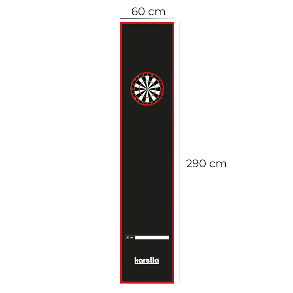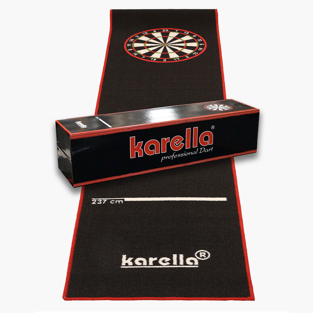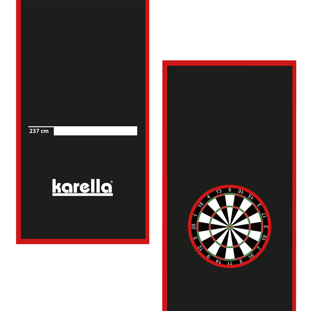 Die Dartmatte Karella Premium Velour entspricht in ihrer Grösse sowie Qualität allen Wettkampfvoraussetzungen. Diese Premium Dartmatte dient nicht nur als Abstandsmarkierung für Steel- und Softdart, sondern schützt gleichzeitig den Boden sowie herunterfallende Dartpfeile vor Beschädigung. Die Karella-Dartmatte besteht aus sehr dichtem und äusserst strapazierfähigem starken Nylonfloor (250 g/m²). Die Unterseite der 5 Millimeter starken Matte ist mit einer absolut rutschfesten Latex-Gummibeschichtung versehen.