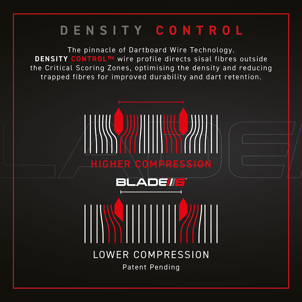 Die wegweisende Verdrahtung des Blade 6 besteht aus dem neuesten Density Control™-Draht, der für eine optimale Faserdichte und einen verbesserten Halt der Darts in den Double-, Triple- und Bullseye-Zonen sorgt. Der ultradünne Draht im 60°-Winkel lenkt die Darts in den Trefferbereich und verringert deutlich die Zahl der Bouncer (Abpraller).