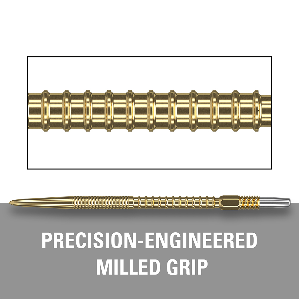 Die Swiss Firepoint verfügen über einen Kombinationsgriff, der aus einer Präzisionsfräsung und Nanorillen auf der Vorderseite der Spitze besteht. Die aus hochwertigem Edelstahl gefertigten und durch einen Vakuumhärtungsprozess verstärkten Spitzen bieten eine längere Haltbarkeit und eine geringere Ablenkung des Flights.