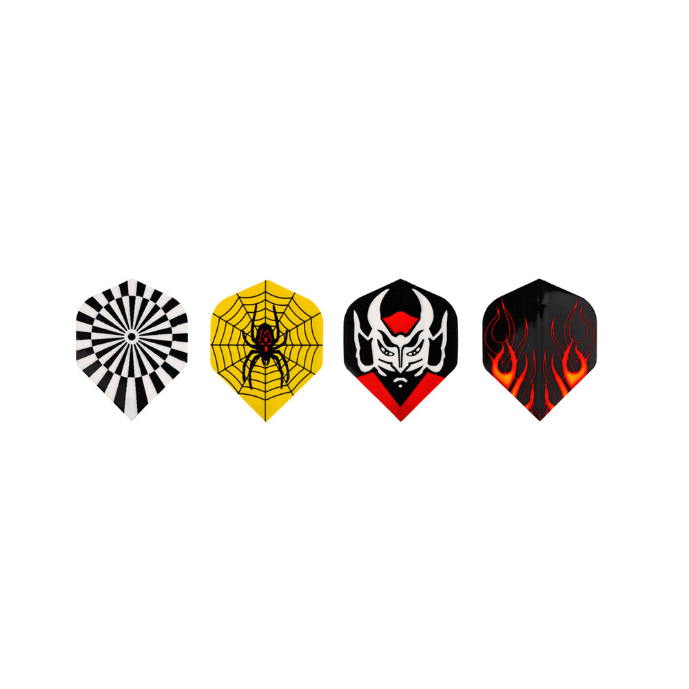 Preiswerte Grossbox mit 100 Sets einzeln verpackter Ersatzflights in 4 attraktiven Motiven in Standard-Form. Geeignet für Steel und Softdarts. Inklusive praktischer PVC Dose mit Haltegriff.