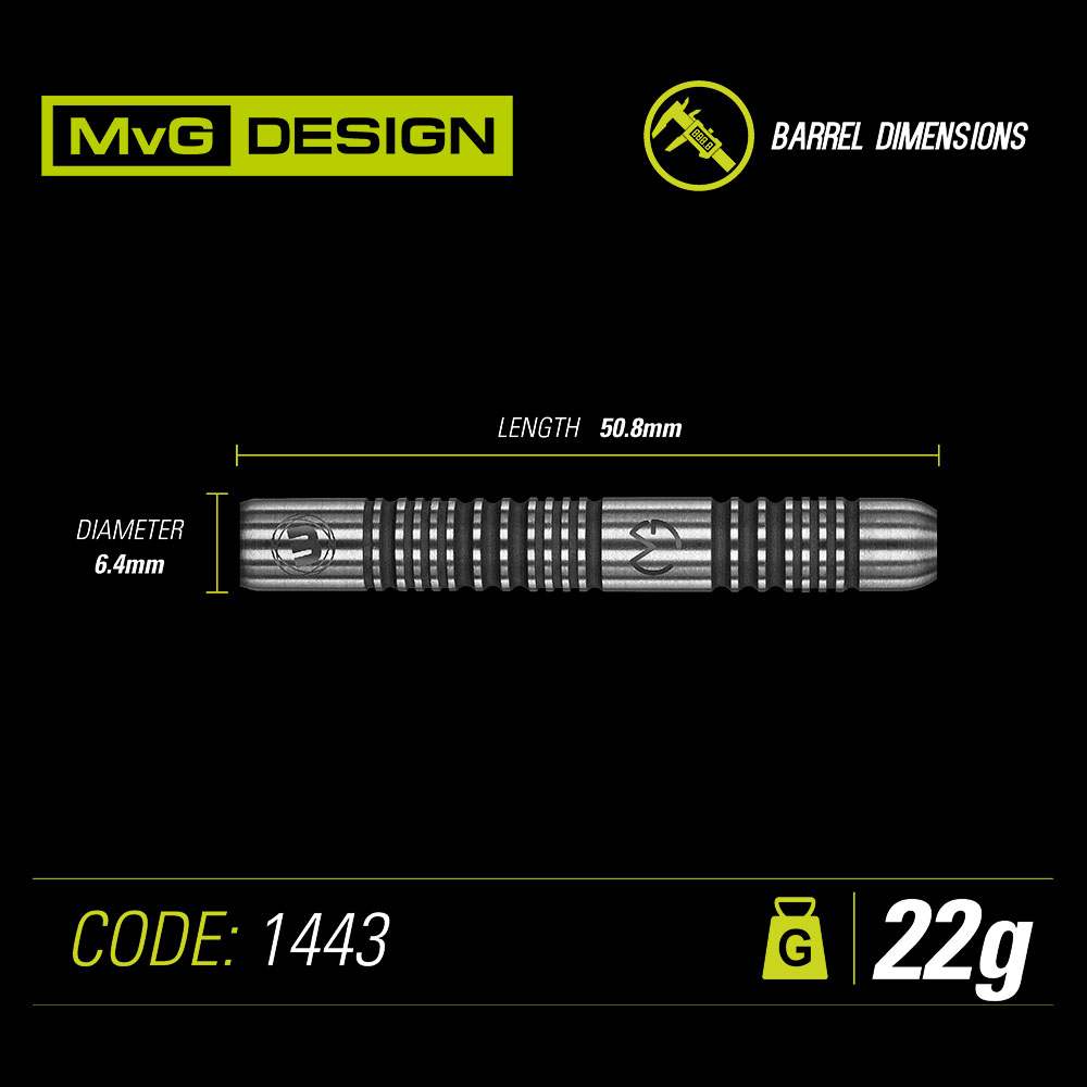Spezifikation: 85 % Tungsten, Shafts: Prism Force medium, Flys: MvG Prism Alpha Standard extra dick, mit Mvg-Logo und Winmau-Logo lasergraviert.