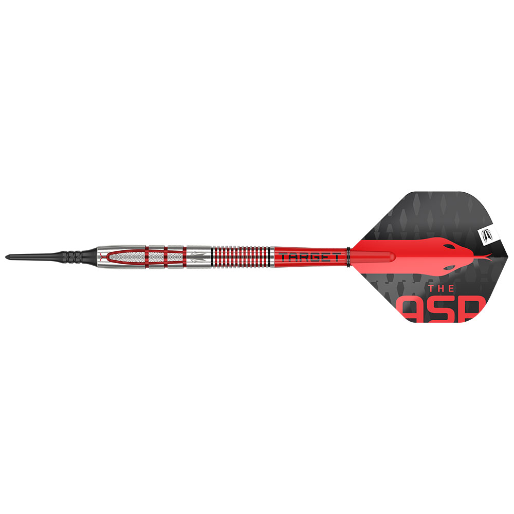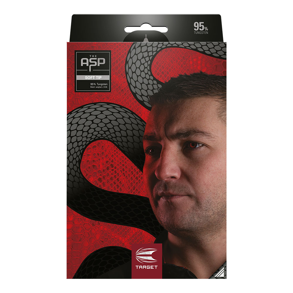 Der Barrel ist mit mehreren Griffprofilen ausgestattet, die ein ausgewogenes Gefühl für den Dart vermitteln. Die Vorderseite des Barrels weist CNC-gefräste Querschnitte auf, die durch natürliche und radiale Rillen voneinander getrennt sind, mit einer Anspielung auf "The Asp" auf der Nase des Barrels. Der Griff geht dann in eine klassische Radialrille auf der Rückseite über, die ein gleichmässiges Gefühl vermittelt. Die Red PVD Performance-Beschichtung wird dann in die Rillen der Darts gelegt und sorgt für mehr Grip und Textur. Der Barrel wird dann mit Target Pro Grip Shafts, Black Pixel Tip und Aspinall Edition Flights veredelt.