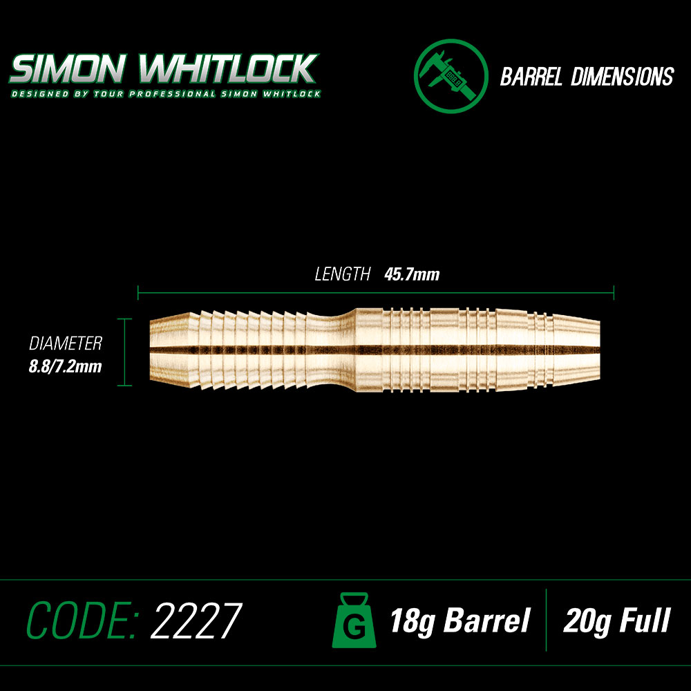 Original Simon Whitlock Softdart in preiswerter Messing-Ausführung. Ideal für den Einsteiger und Hobbyspieler. Ausgestattet ist der 18 g-Dart mit einem schwarzen Winmau Nylon-Shaft und einem Profi-Fly „Rhino Extra Thick“, der mit der Signatur von Simon Whitlock versehen ist.