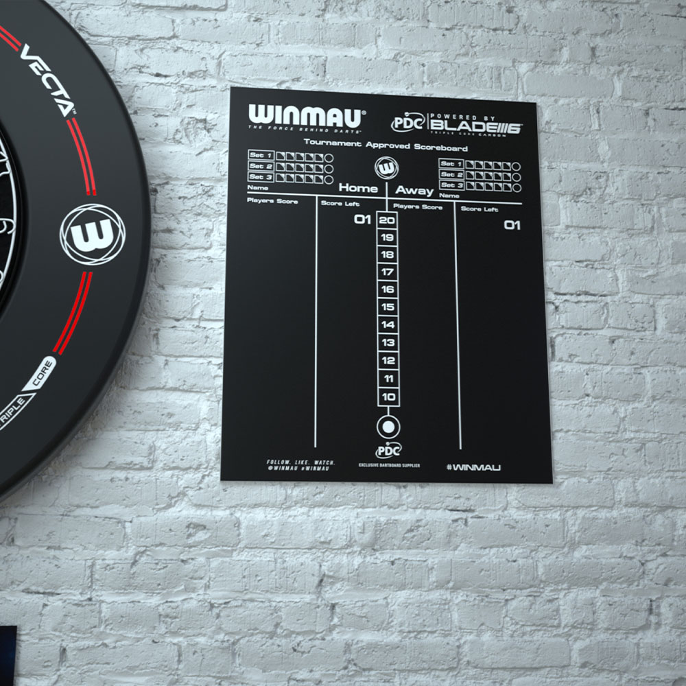 Das offizielle Winmau Scoreboard kann beidseitig benutzt werden. Vorne als „White-Board“ bei dem die Ergebnisse wieder trocken abgewischt werden können und Rückseite als traditionelle schwarze Kreidetafel. Die grosse praktische Zähltafel ist geeignet für alle gängigen Spiele wie 301 und 501 sowie Cricket und wird turniermässig von der Britisch Dart Organisation offiziell eingesetzt. Inklusive 2 schwarzen Schreibstiften und einfacher Wandbefestigung.