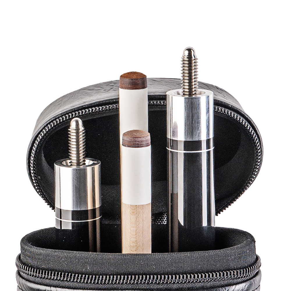 Feinstes Kunstleder das kaum von Echtleder zu unterschieden ist zeichnen die Original Robertson Köcher aus. Die hochwertige Verarbeitung ist auf den ersten Blick zu erkennen und zu fühlen. Die Innenfächer sind mit einem gefütterten Gewebestoff zum Schutz der Cues sorgsam überzogen. Aussen bietet der Köcher mit seinen Aussentaschen noch viele Platz für Zubehör sowie einem Jump-Unterteil. Der massive, verstellbare Trageriemen ist wie auch der Tragegriff sehr robust verarbeitet. Ausführung 2/2 (für 2 komplette Cues)