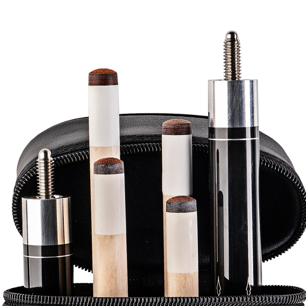 Feinstes Kunstleder das kaum von Echtleder zu unterschieden ist zeichnen die Original Robertson Köcher aus. Die hochwertige Verarbeitung ist auf den ersten Blick zu erkennen und zu fühlen. Die Innenfächer sind mit einem gefütterten Gewebestoff zum Schutz der Cues sorgsam überzogen. Außen bietet der Köcher mit seinen Aussentaschen noch viele Platz für Zubehör sowie einem Jump-Unterteil. Der massive, verstellbare Trageriemen ist wie auch der Tragegriff sehr robust verarbeitet. Ausführung n 2/4 (für zusätzliche 2 Ersatzoberteile oder Jump-Oberteil).