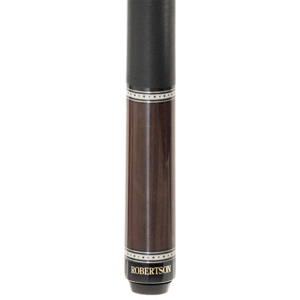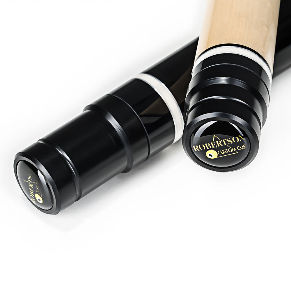 Neben den Ebenholzfarbigen Spitzen oberhalb vom Griff bestechen die auffälligen weiss-schwarzen Zierringe im Unterteil sowie passend dazu am schwarzen Joint. Verbunden wird das Oberteil durch einen sicheren 3/8-6 Quick Lock Steel-Gewinde. Neben dem optischen Highlight garantiert der Robertson Queue auch Top-Spielqualität und erfüllt alle Voraussetzungen für erfolgreiches Spielen auf höchstem Niveau. Ausgeliefert wird der jeder Queue mit einem Original Robertson Gewindeschutz.