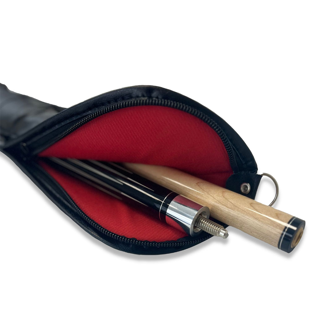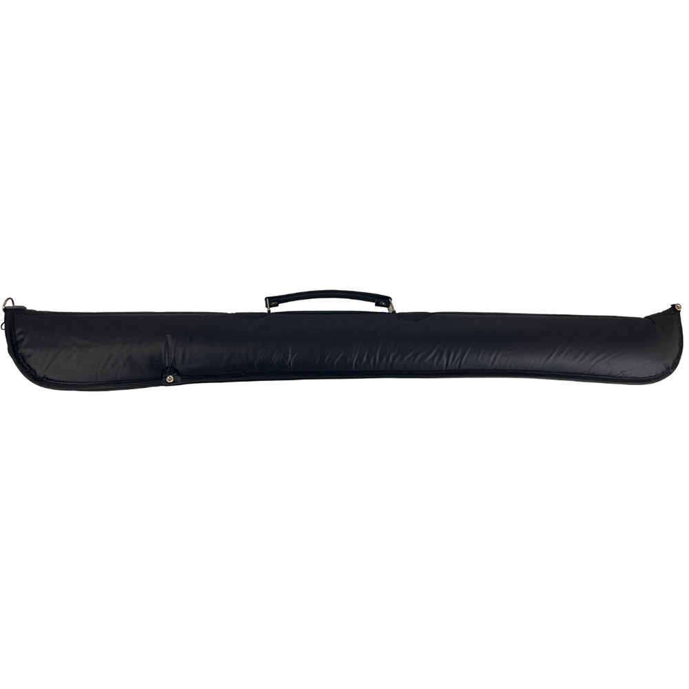 Queuetasche Standard ist eine traditionelle schwarze Kunststofftasche mit obigem Reissverschluss. Innen ist sie ausrechend gut mit rotem Samtstoff gefüttert für Unterteil und Oberteil. Mit Tragegriff. Länge 78cm